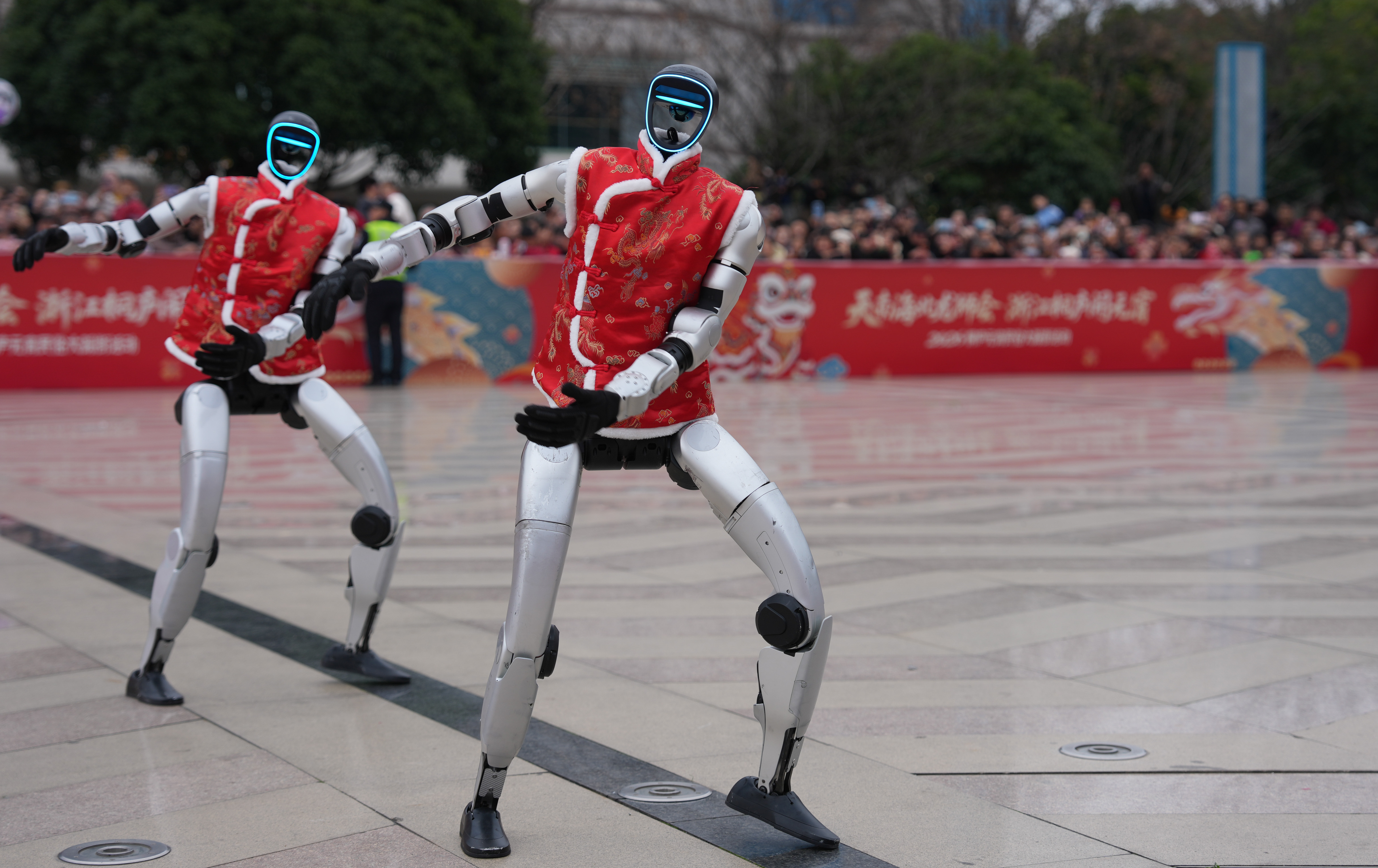 2026年2月28日,宇树科技人形机器人在浙江省桐庐县中心广场表演舞蹈。