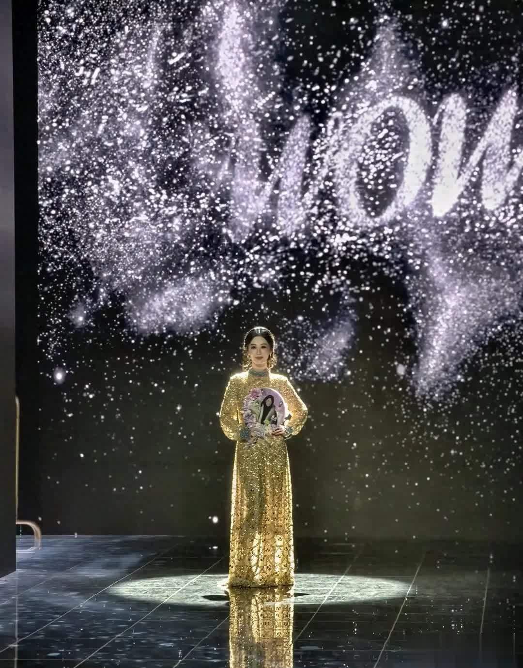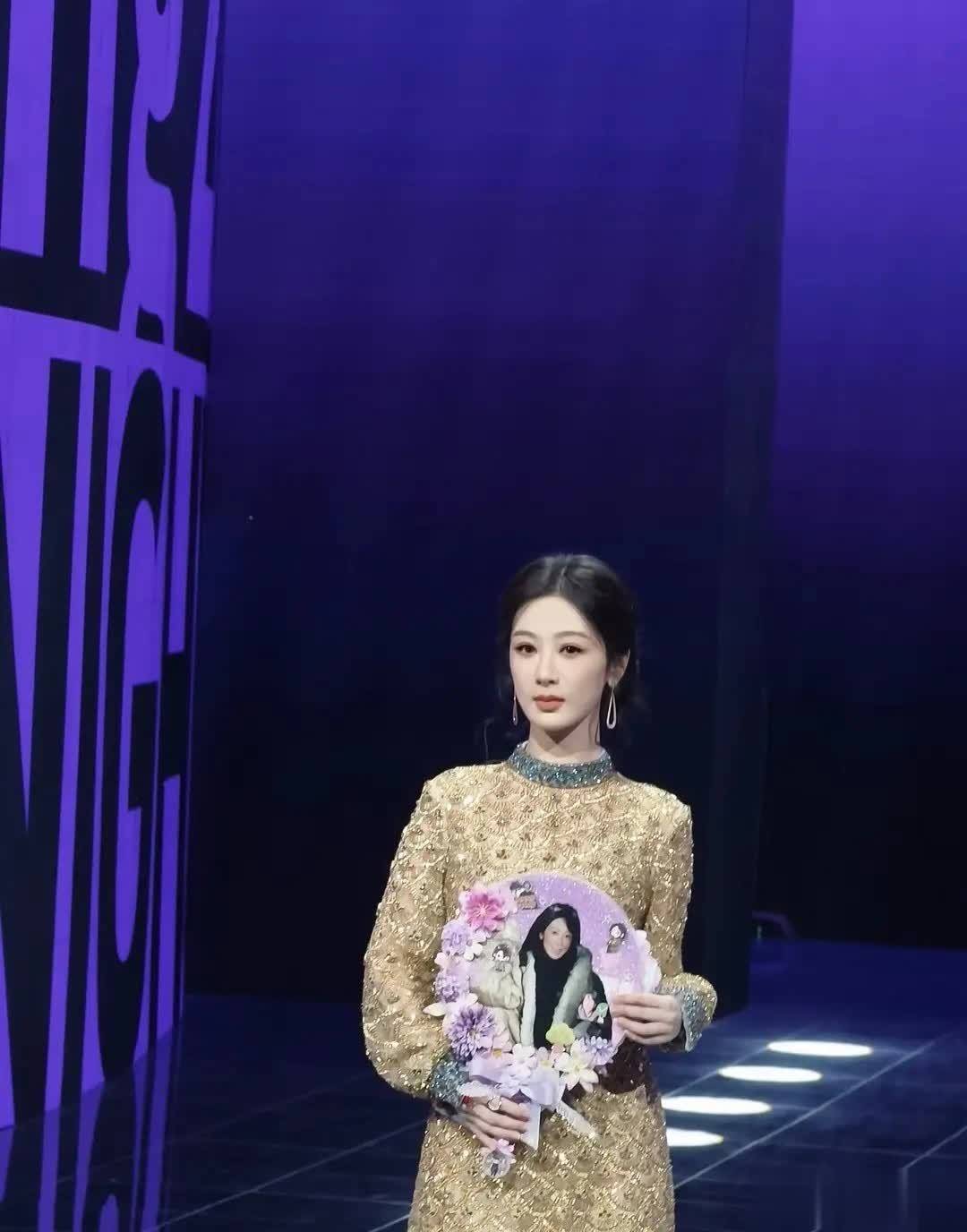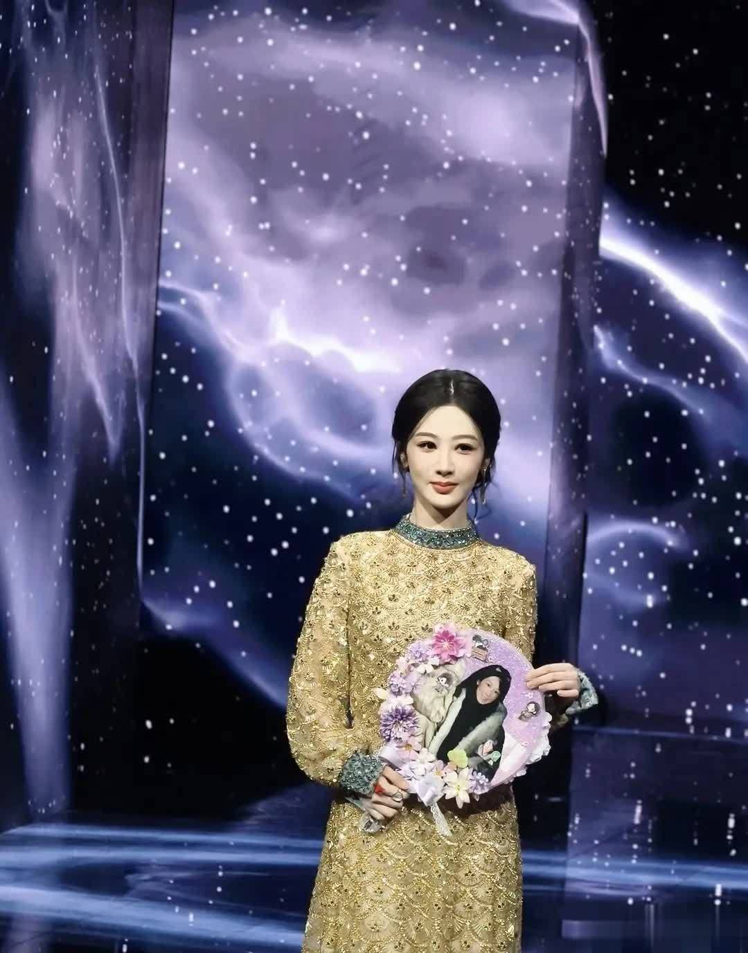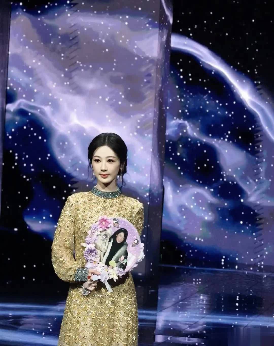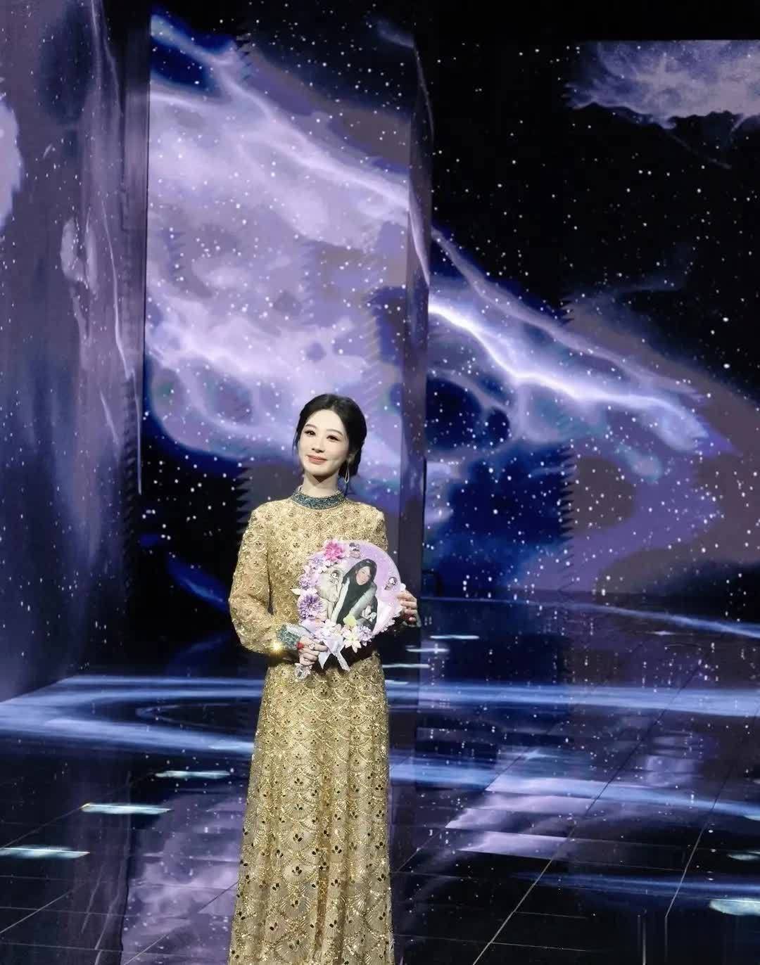 她穿的是Valentino特别定制款,满裙亮片在灯光下闪得像星光,垂坠感超棒,衬得她身形挺拔又温柔。利落盘发露出精致肩颈,妆容清透干净,笑起来还是那个甜妹,眼神里却多了几分从容大气。